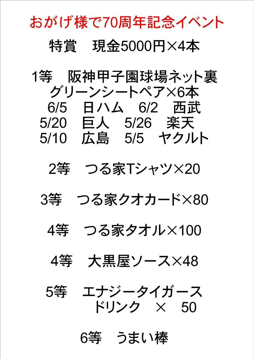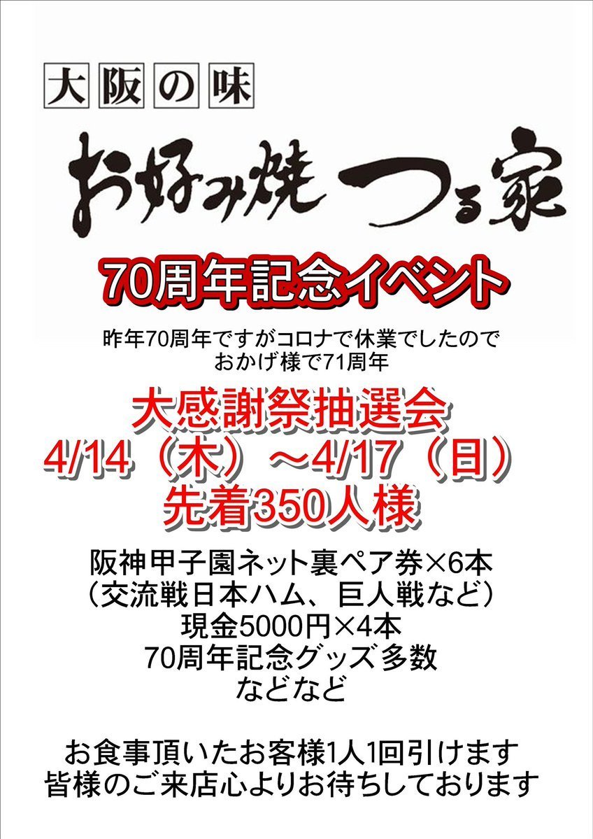 平素は、格別のご高配を賜り、厚く御礼申し上げます。このたび「お好み焼つる家」は2021年に創業70年を迎えるに至りました。これもひとえに皆様のご支援ご厚情に賜物と深く感謝いたしております。ささやかながら記念イベントをご用意致しました。皆様のご来店お待ちしております。