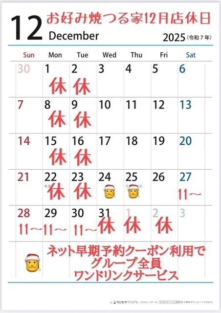 お好み焼つる家12月定休日のお知らせ